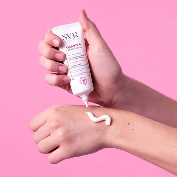 يضمن Cicavit+ Cream SPF50+ صيفًا خاليًا من العلامات! قوامه غير المرئي يندمج مع الجلد ليعمل على يهدئ بشكل مكثف ويسرع عملية إصلاح البشرة X7(1) الجلد التالف والمتهيج لجميع أفراد الأسرة. تم تركيبه باستخدام تقنية الترشيح مضاد للأشعة فوق البنفسجية الطويلة والمتوسطة (UVA/UVB) ومركب مضاد للأكسدة مضاد للأشعة تحت الحمراء والمرئية‎يستهدف الكريم جميع أنواع الأشعة(2) للحد من مخاطر العلامات الحمراء والبنية.